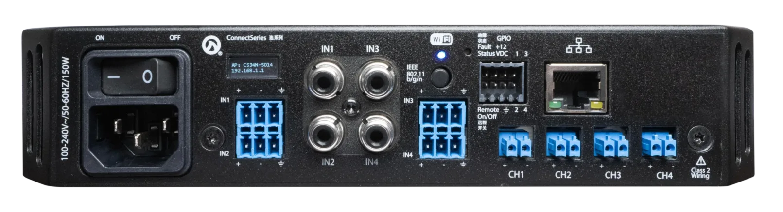 Le CS34 propose une connectivité audio flexible avec quatre entrées analogiques équilibrées ou non équilibrées, et une matrice de routage audio DSP qui permet d’acheminer librement n’importe quel source vers n’importe quel canal. Son traitement DSP 96 kHz offre des filtres de croisement jusqu’à 48 dB/Oct, égalisation paramétrique 8 bandes par canal, limiteurs et monitoring en temps réel, simplifiant ainsi la configuration et la protection des haut-parleurs.